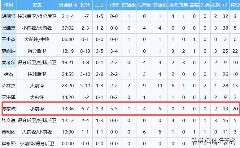 广东男篮最大的惊喜是20岁后卫陈家政,连续两场被杜锋雪藏后,他在这场比赛中暴走,末节7中6砍下20分,三分球3中3,罚球5中5,全场也只打了13分钟,表现十分炸裂!