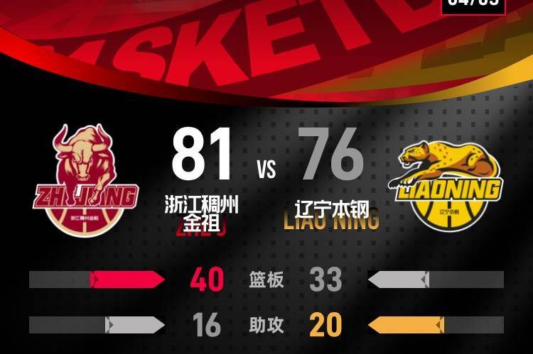 【搜狐体育战报】北京时间4月3日CBA常规赛第34轮,主场作战的浙江稠州金租以81-76击败辽宁本钢,浙江稠州金租取得4连胜。达卡里·约翰逊18分16篮板5助攻,付豪20分8篮板0助攻。